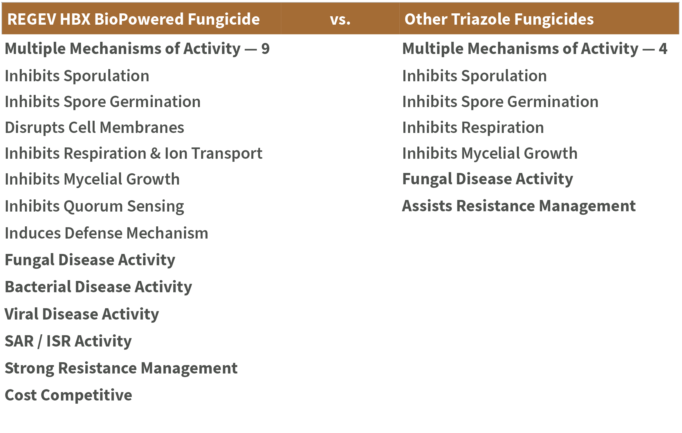 REGEV HBX is a science-backed solution for modern crop disease management designed to address the many challenges facing growers today, including resistance development, chemical load, residue levels and sustainability. The BioPowered Chemistry of REGEV HBX achieves this while enhancing growth, boosting yield, reducing risk and improving profitability.